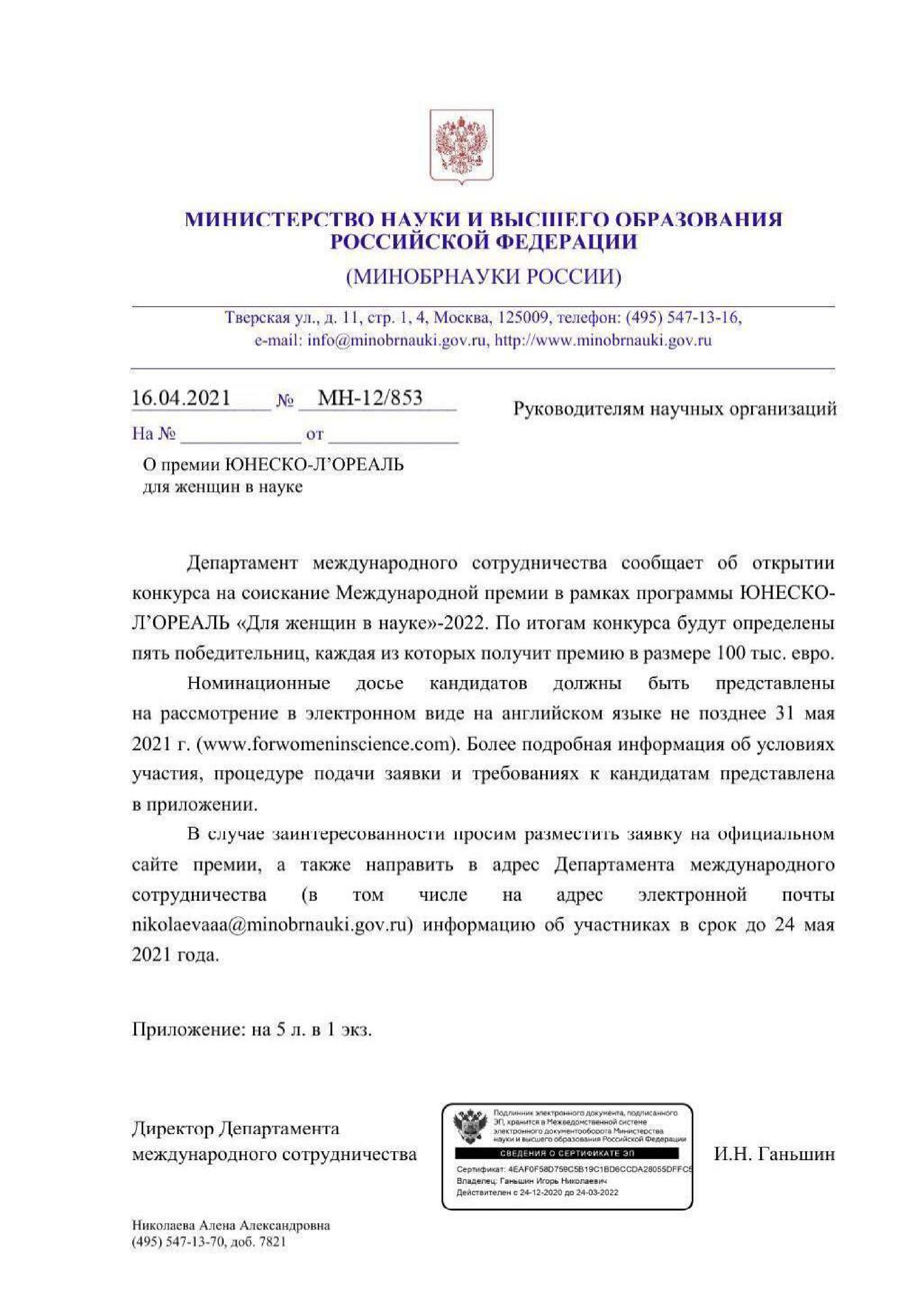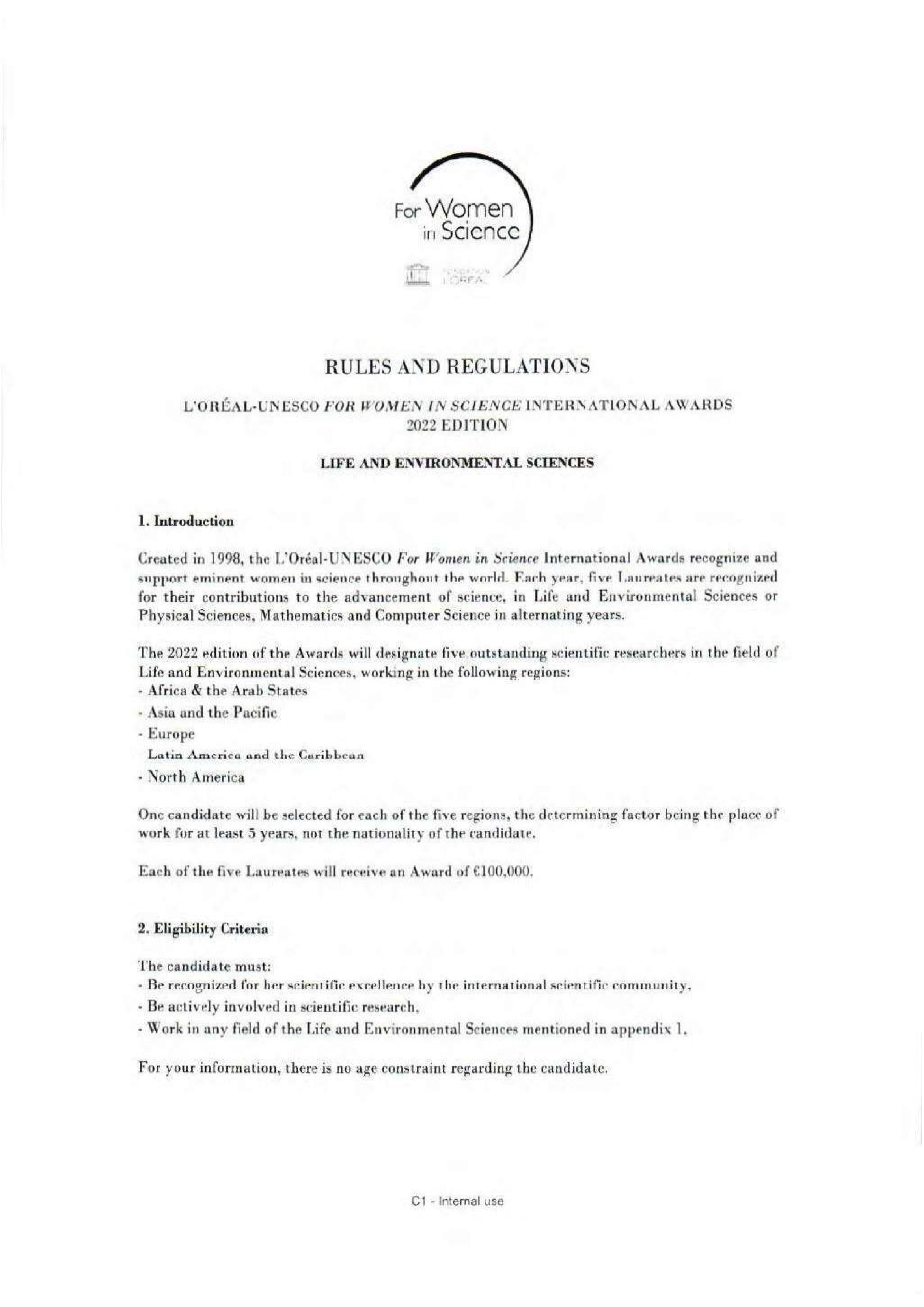 Конкурс на соискание Международной премии в рамках программы ЮНЕСКО-Л'ОРЕАЛЬ "Для женщин в науке"-2022